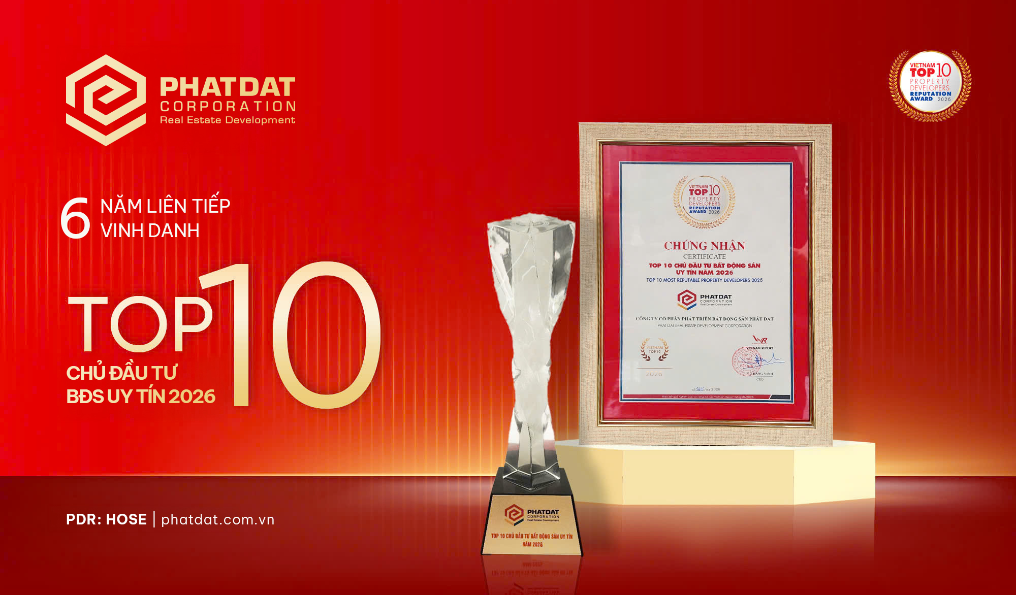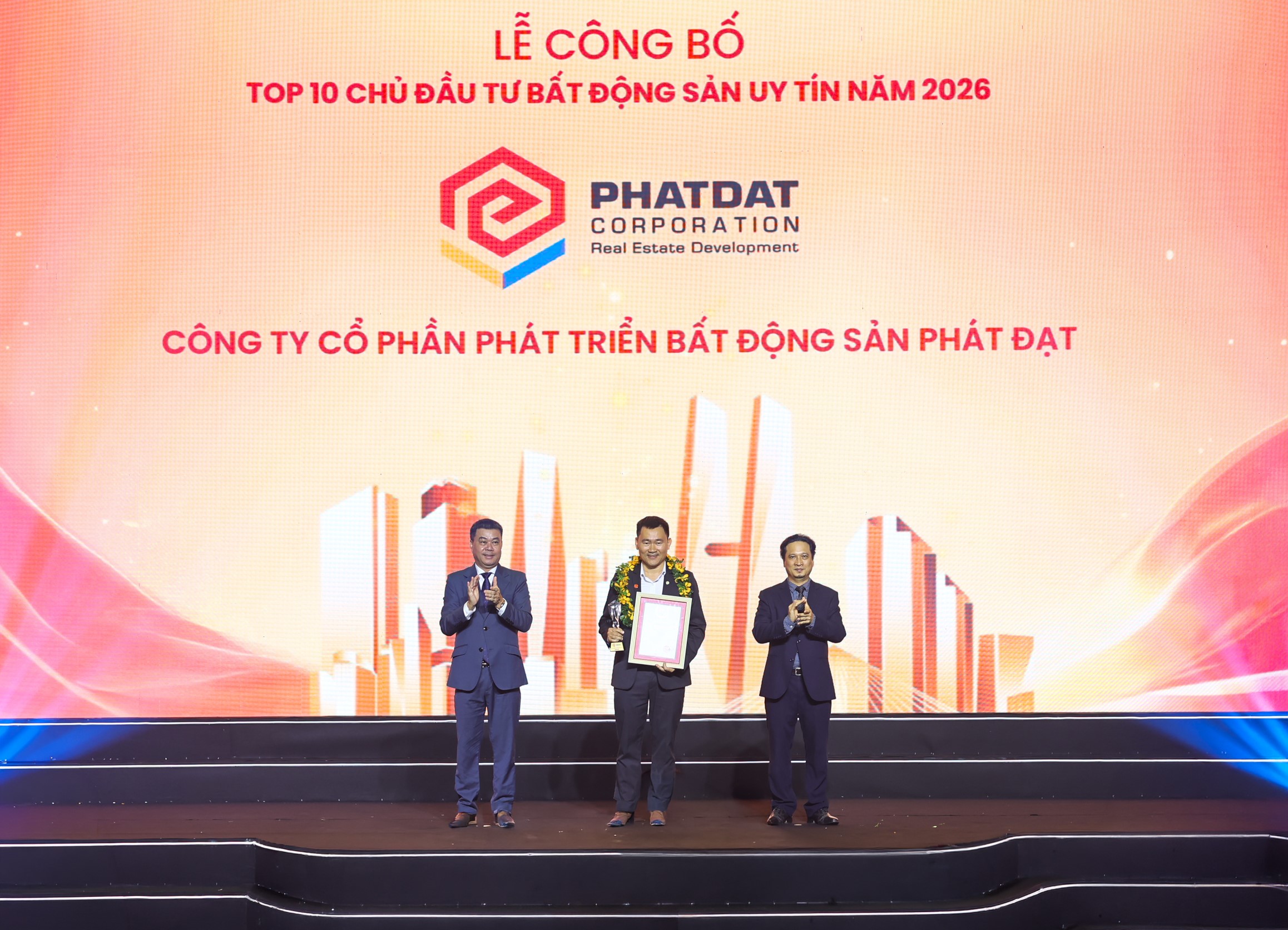 Ngày 22/04/2026, tại Lễ công bố Top 10 và Top 5 Công ty uy tín ngành Bất động sản – Xây dựng – Vật liệu xây dựng năm 2026 diễn ra tại Trung tâm hội nghị Thiskyhall (TP.HCM), Công ty Cổ phần Phát triển Bất động sản Phát Đạt (PDR: HOSE) được vinh danh trong Top 10 Chủ đầu tư Bất động sản uy tín năm 2026. Đây là năm thứ sáu liên tiếp doanh nghiệp góp mặt trong bảng xếp hạng này.
